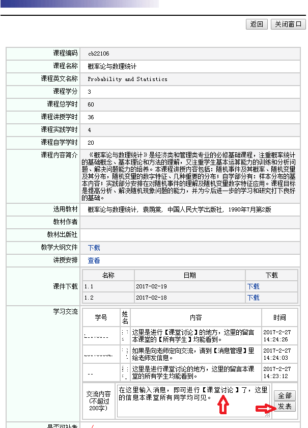 点击课表里的【课程名称】,在交流内容处输入交流信息,点击【发表】,即可进行课堂讨论了,此处的交流信息本课堂所有同学均可见。