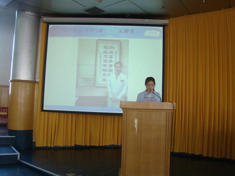 会计15-1班王静雯同学代表老生向新同学表示欢迎,勉励同学们不断更新知识,注重理论与实践相结合,在学以致用中更好地突破自我。